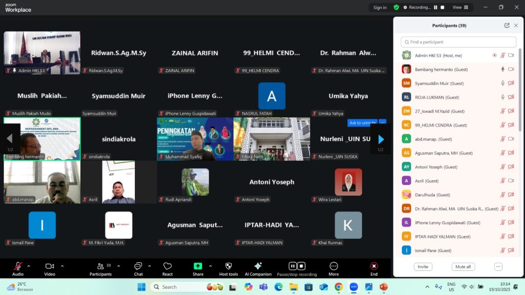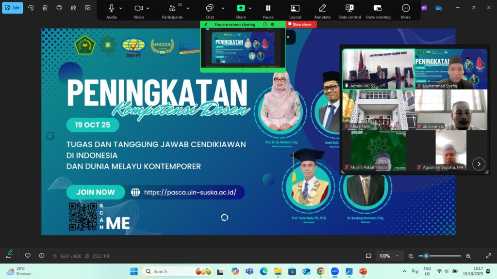 Pekanbaru, 19 Oktober 2025 — Program Doktor Pascasarjana Universitas Islam Negeri (UIN) Sultan Syarif Kasim Riau kembali menyelenggarakan kegiatan ilmiah dalam bentuk hybrid, bertajuk “Peningkatan Kompetensi Dosen: Tugas dan Tanggung Jawab Cendekiawan di Indonesia dan Dunia Melayu Kontemporer.” Kegiatan yang dilaksanakan pada pukul 08.00 hingga 11.00 WIB ini dihadiri oleh dosen, peneliti, dan mahasiswa Pascasarjana UIN Suska Riau. Kegiatan ini menjadi wadah penting bagi sivitas akademika dalam memperkuat peran intelektual Muslim di tengah dinamika perkembangan dunia pendidikan dan keilmuan kontemporer.